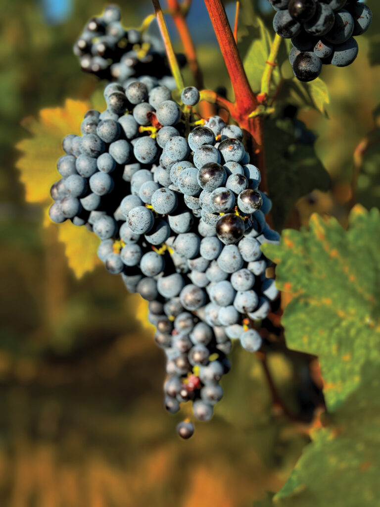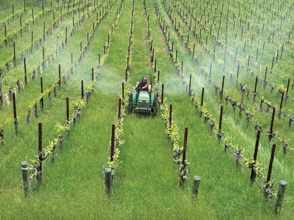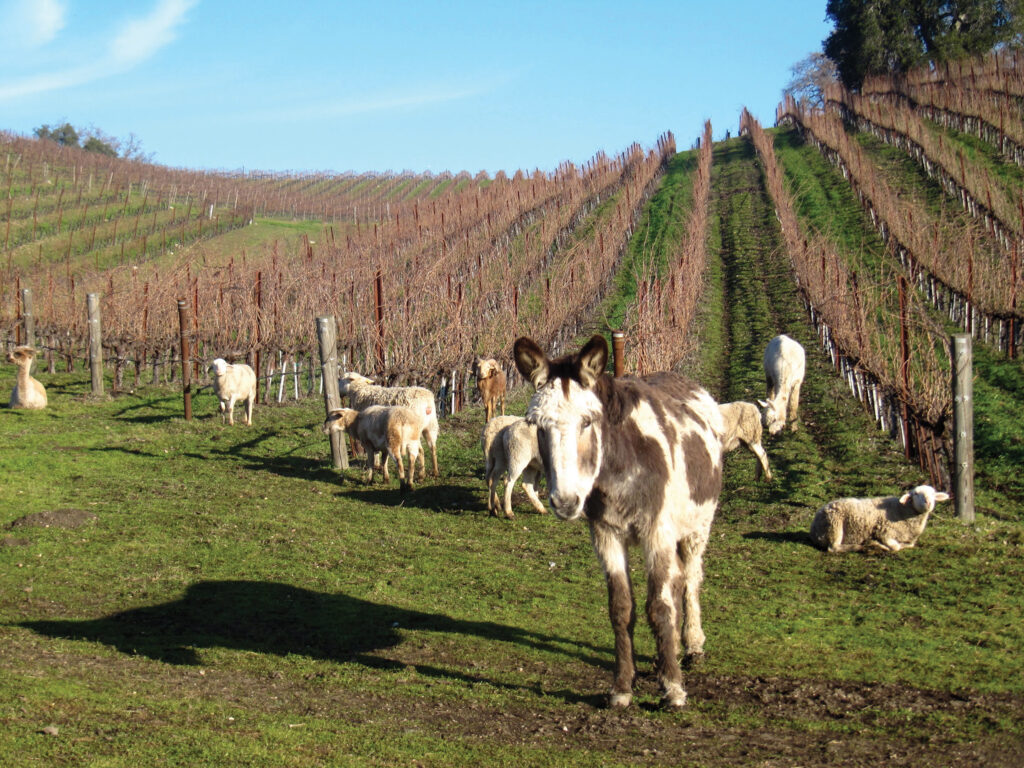 In conventional vineyards, there can be “very old-school” thinking that “the floor of the vineyard should be clean, cultivated, tilled, clean of weeds,” Whitlow says. “But what happens when you do that is you’re exposing the soil and that basically kills the soil’s microbiome because of the sun hitting it.” In the world of regenerative farming, Whitlow says, “a very diverse cover crop in-between the perennial vines” is “one of the most important tools” for soil health. Cover crops help prevent soil from drying up, give grazing animals a place to deposit nutrient-filled manure, and attract beneficial insects that prey on pests.