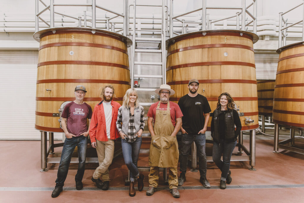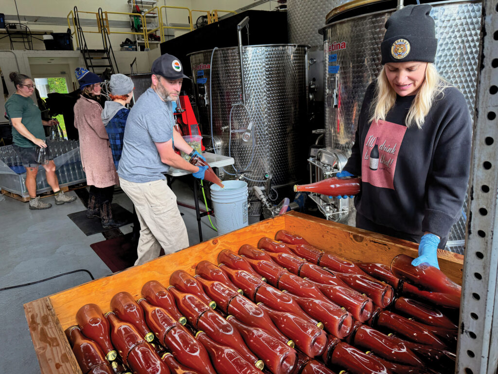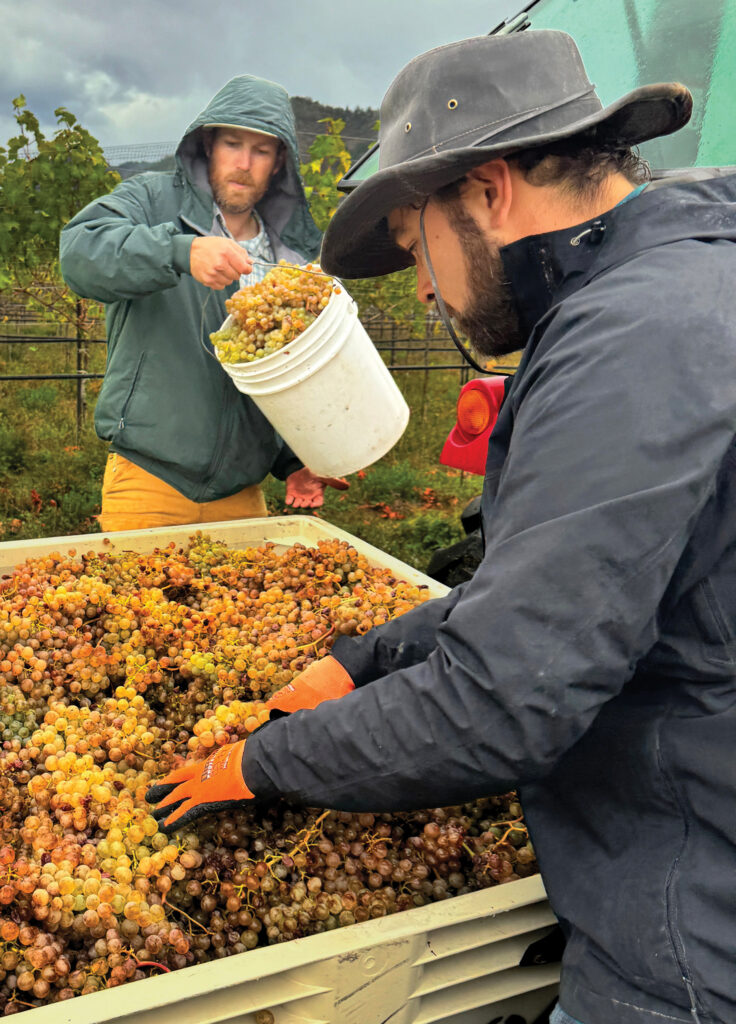 1. Winemaker Nate Wall (left) and Farm Sales Director Jennifer Teisl (right) load Pétette into tirage bins.