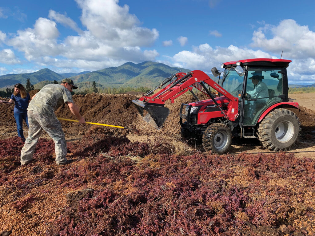 1. Pomace fresh from the press is added to a new compost pile. Everything from the harvest is recycled back to the soil.