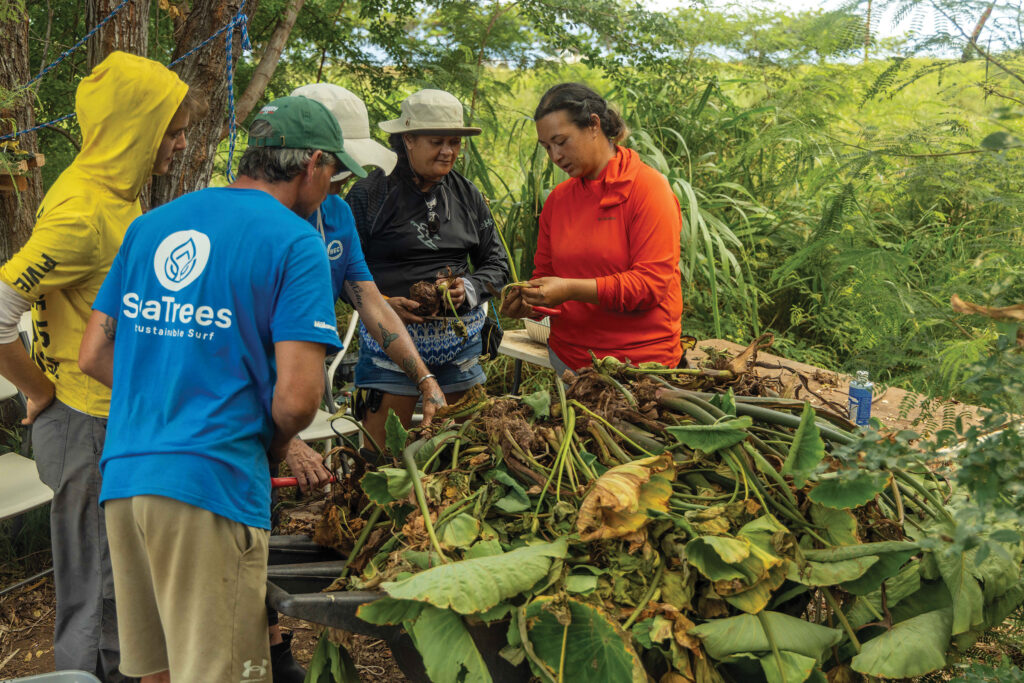 2. The crew sorts through a Taro harvest. Taro is a nutrient-dense root vegetable and a staple of Hawaiian cuisine.