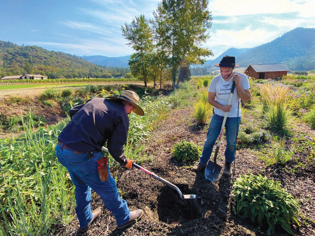 2. Farm manager Adan Cortes (left) and Director of Agriculture Garett Long (right) dig up finished stinging nettle, which fermented underground over the winter.