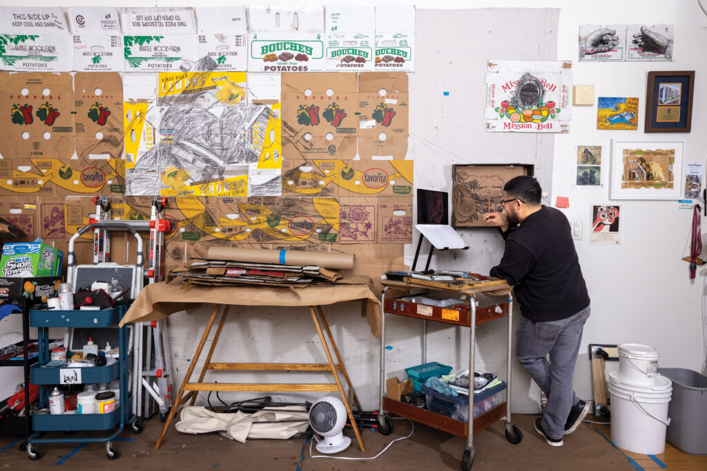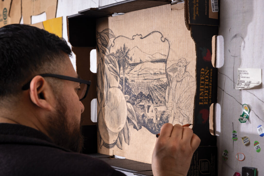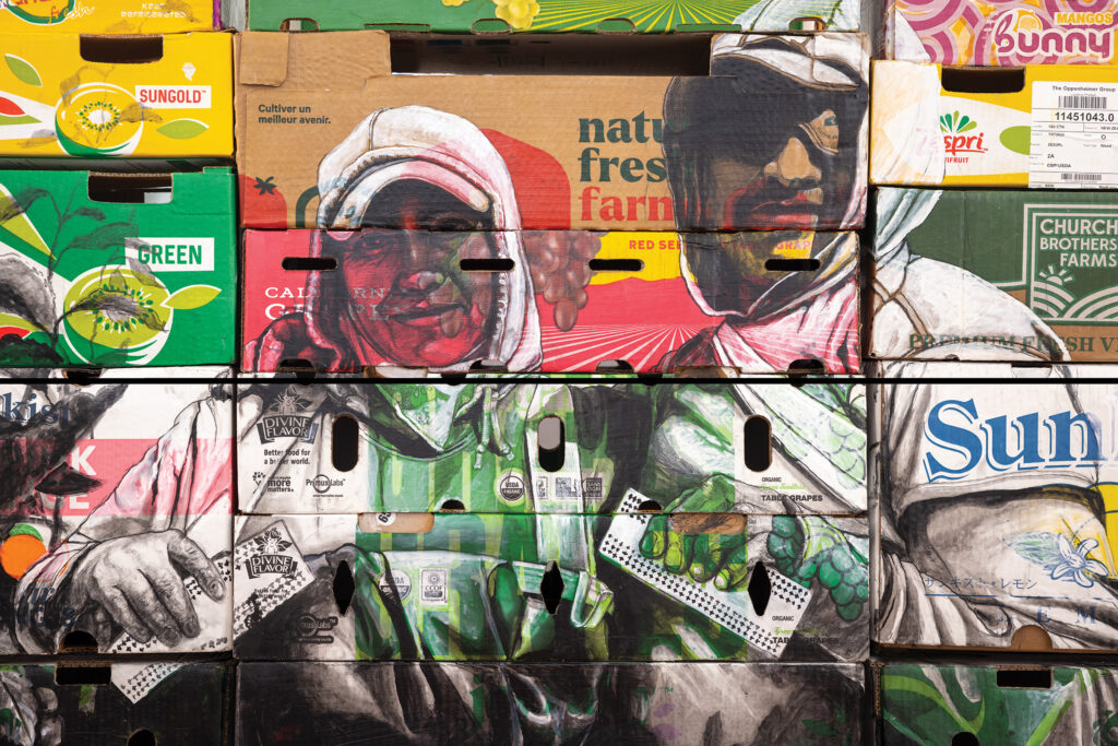 “Write what you know” is conventional wisdom among authors, but similar advice is shared among artists, too. A landscape, a medium, a portrait or theme comes across as far more authentic when created by someone who has actually experienced it. Narsiso Martinez, best known for painting portraits of farmworkers on discarded produce boxes, delivers that authenticity. For nearly a decade, the L.A.-based artist from Oaxaca, Mexico, worked in fruit orchards and crop fields to pay for art school. His vivid pieces, shown in galleries and museums all over the United States — including the Los Angeles County Museum of Art and the Museum of Fine Arts, Houston — provide a rare, personal, and deeply honest look into the lives and working conditions of immigrant farmworkers in the modern American agricultural industry. Martinez tells The Rooted Journal that beyond the pain or struggle inherent in farmwork, he aims to portray the simple humanity of these essential workers.